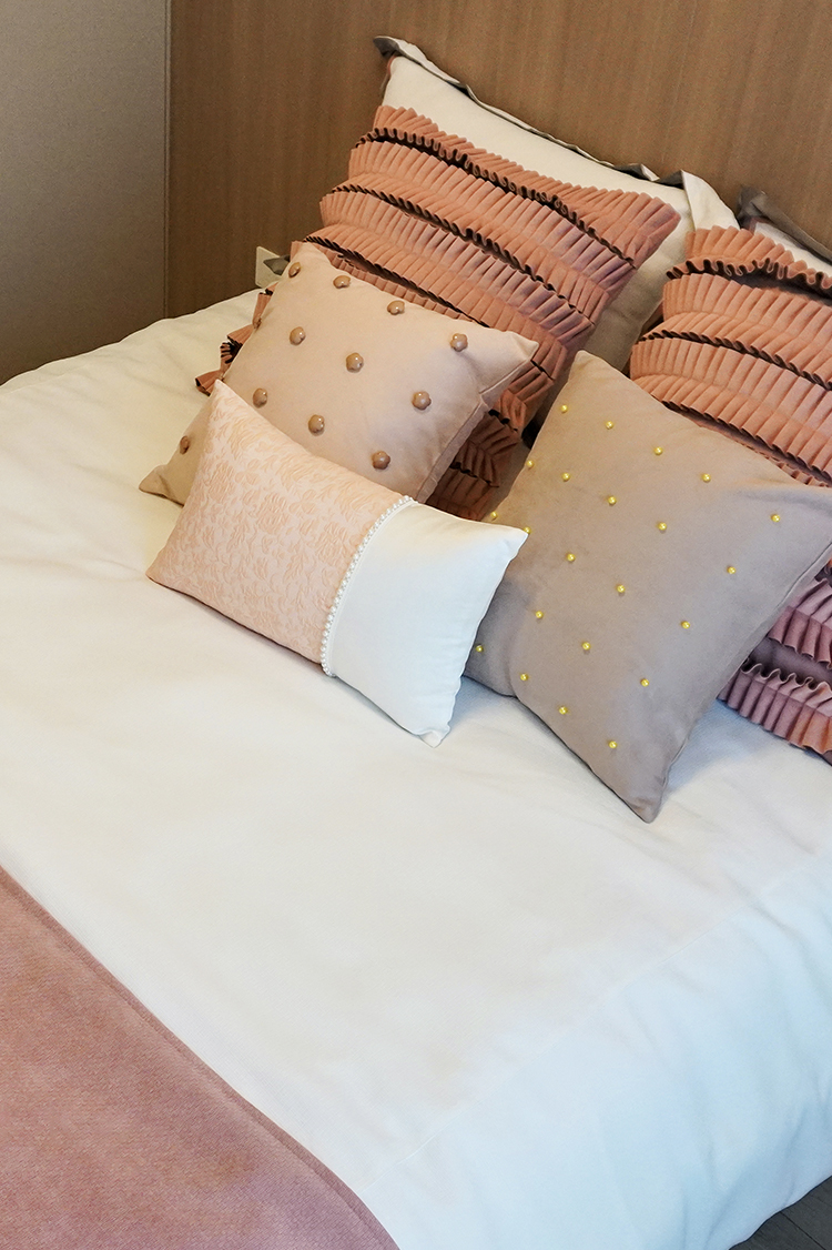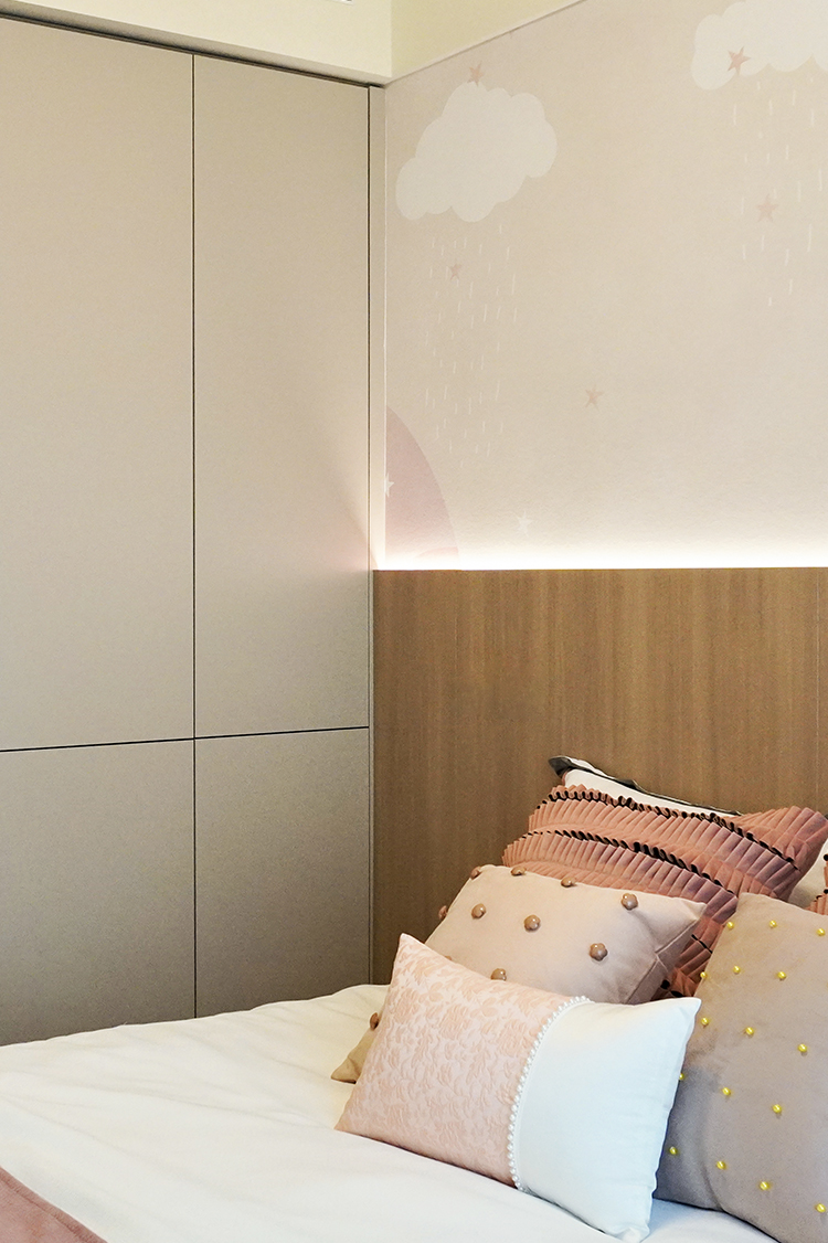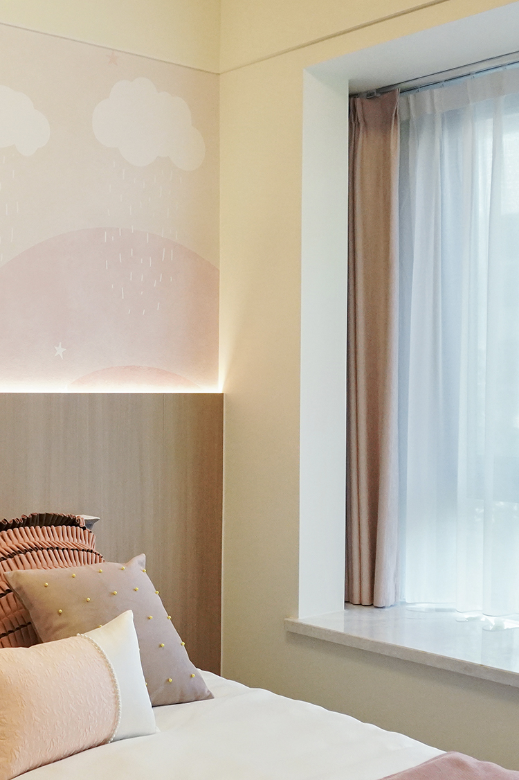 纯粹而轻盈的粉色系布局,清新中略带雅致。温润舒适的木质材质,从床头背板蔓延至收纳柜,再与灰色柜板交织出错层变化,整体又兼具灵动节奏。