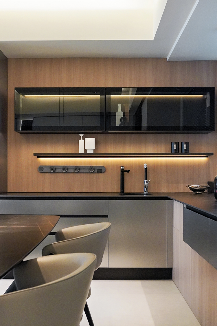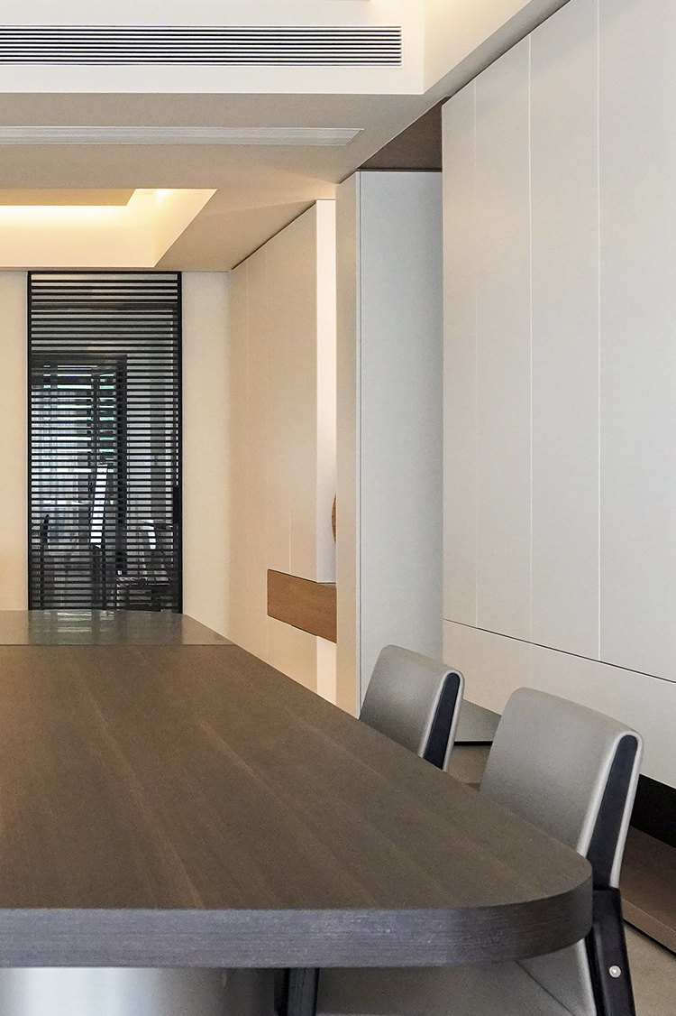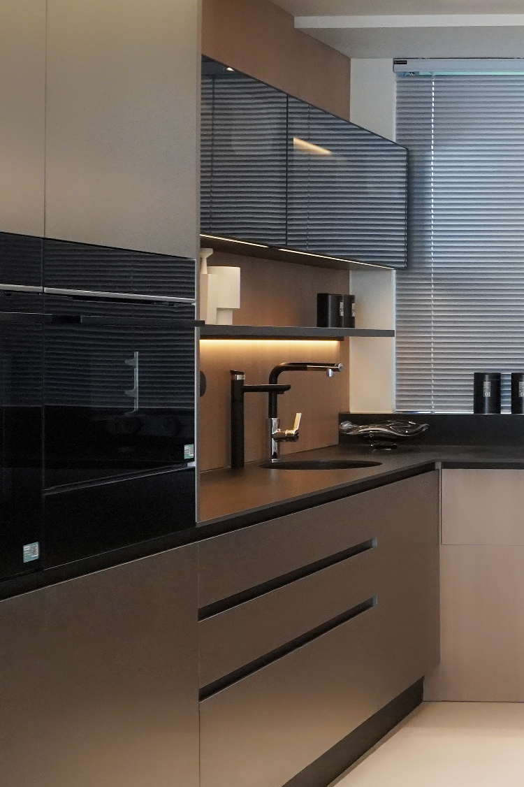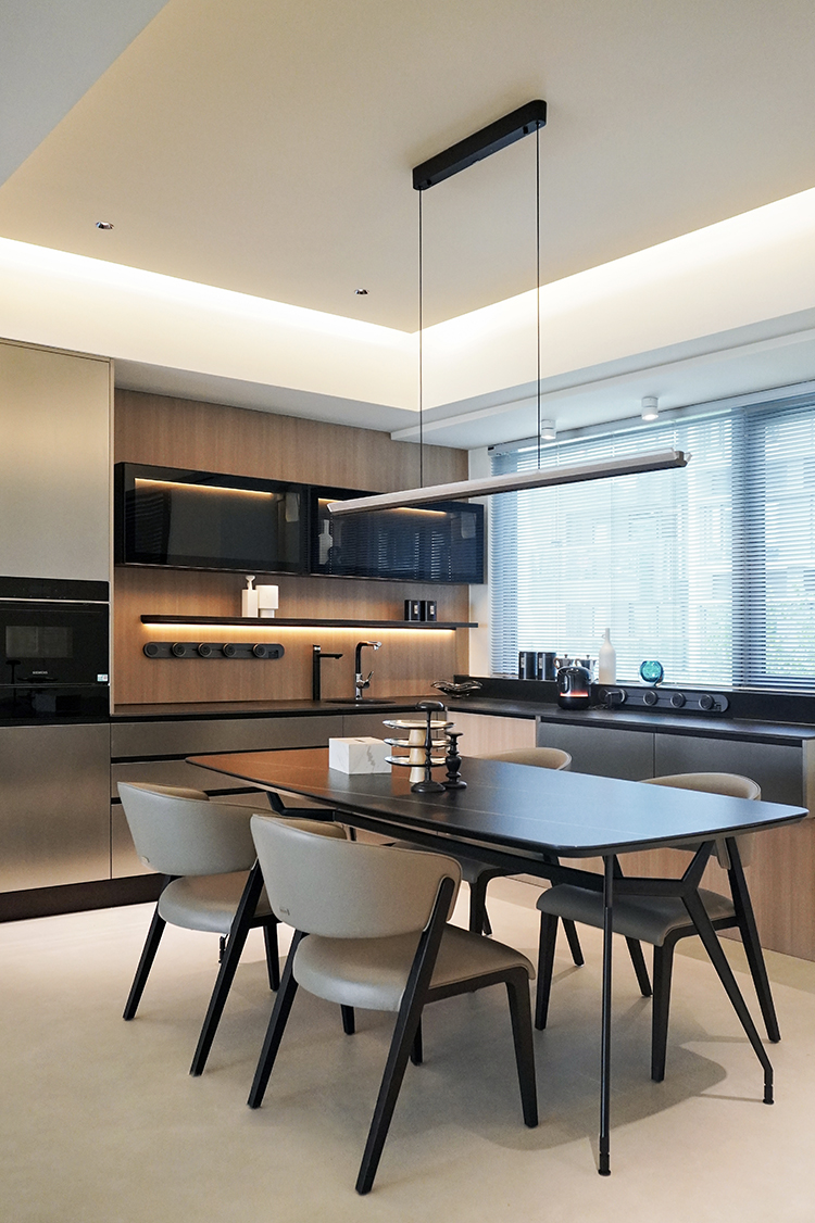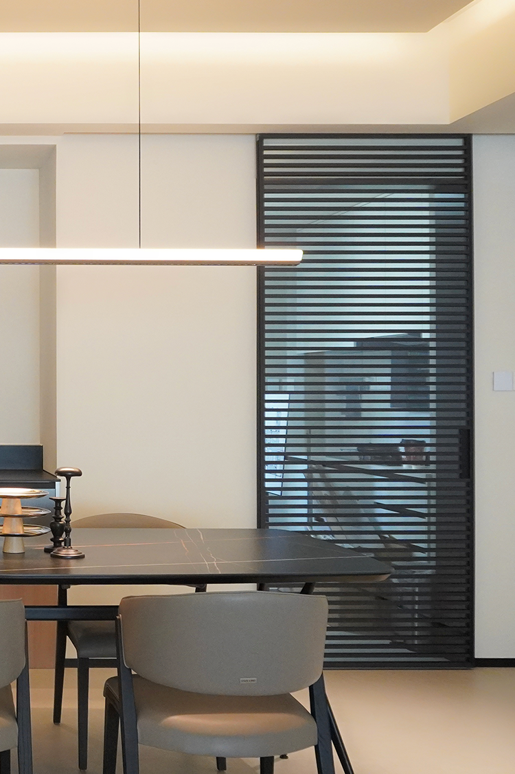 平整自在的黑色线面,随性延展却自成秩序,与银灰、木质结构优雅拼接,巧妙整合餐厨空间的功能性。一道高挑简约的黑色格栅,隐没了中厨空间的繁杂,又平添朦胧美韵。