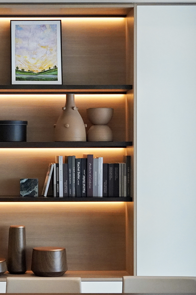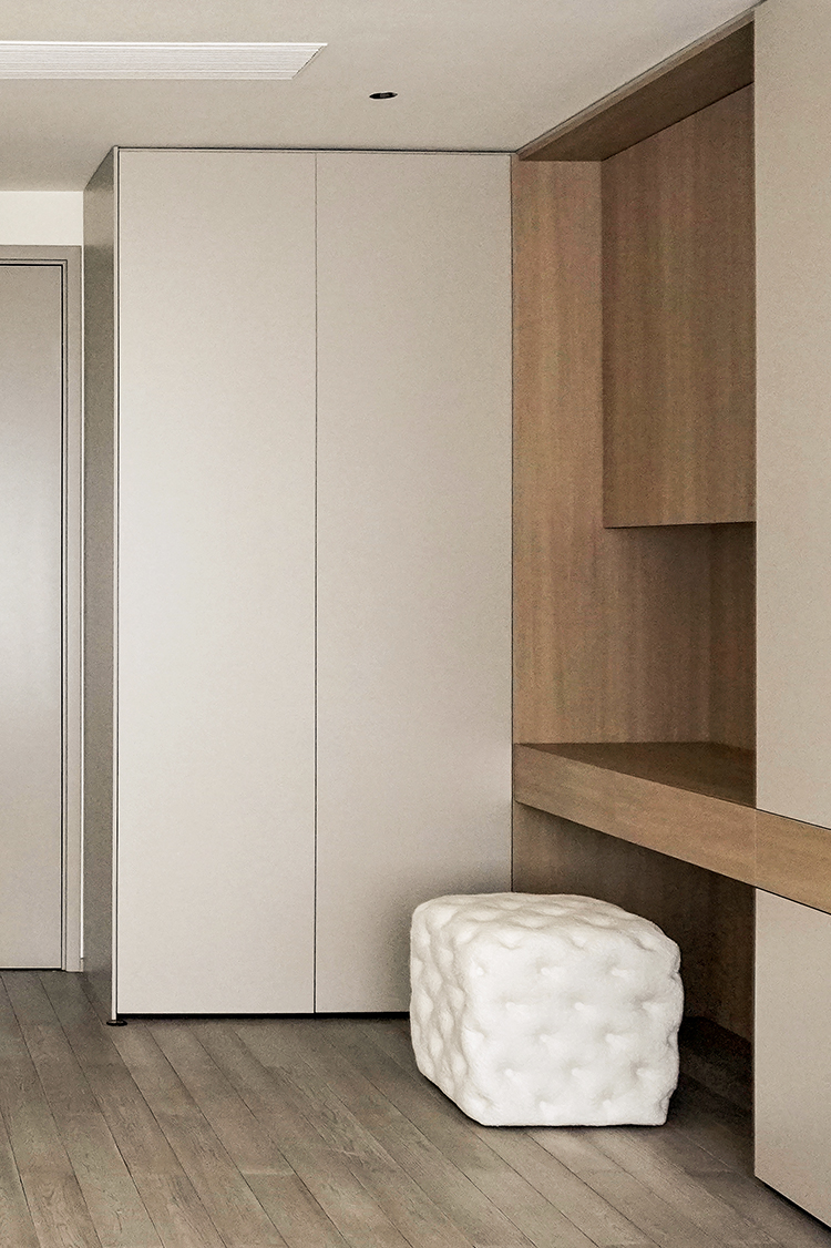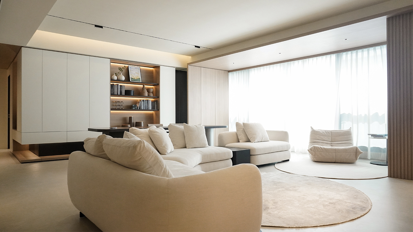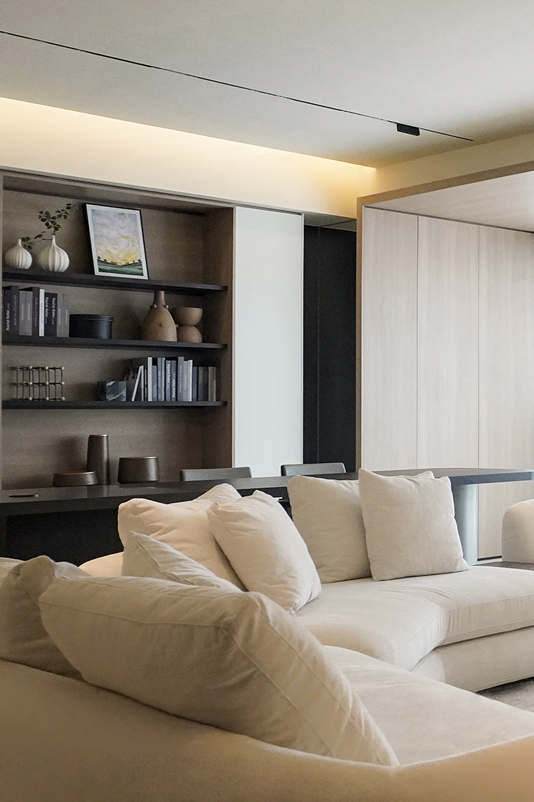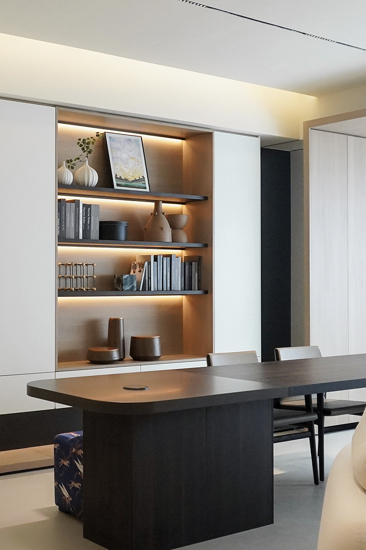 与客厅相对的开放角落,扩展客厅尺度,共享同一处热闹与慵懒。白色悬浮书柜穿插木质背板,深色底边与书桌构成高低层次,充盈空间氛围。闲坐于此,在自然光线的拂照下,静享从容心境。