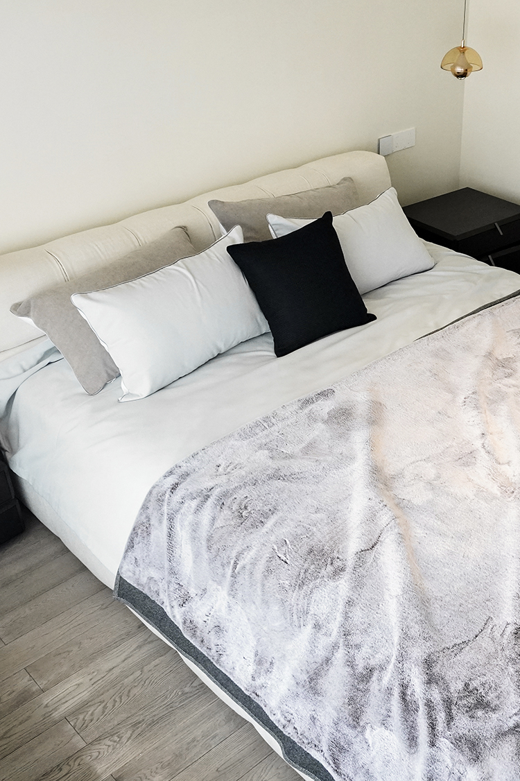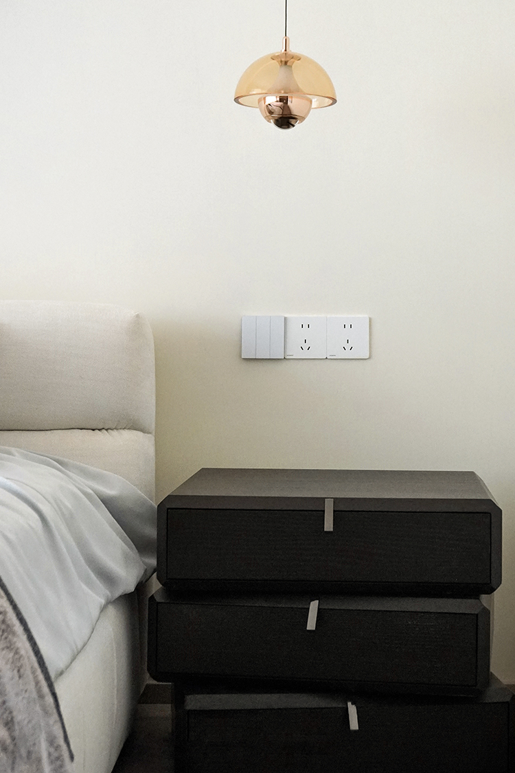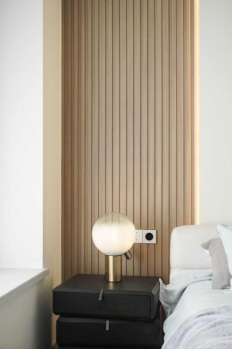 以淡雅色调完成现代感设计,唤醒身心对家的感知。白色软床与墙面制造大面积留白,为真实的自己留出空间,黑色床头柜则以相对的色调丰富空间张力。横向穿插的木质梳妆台,与收纳柜构成平整的一体结构,并与床头的木质竖纹既呼应又对比。