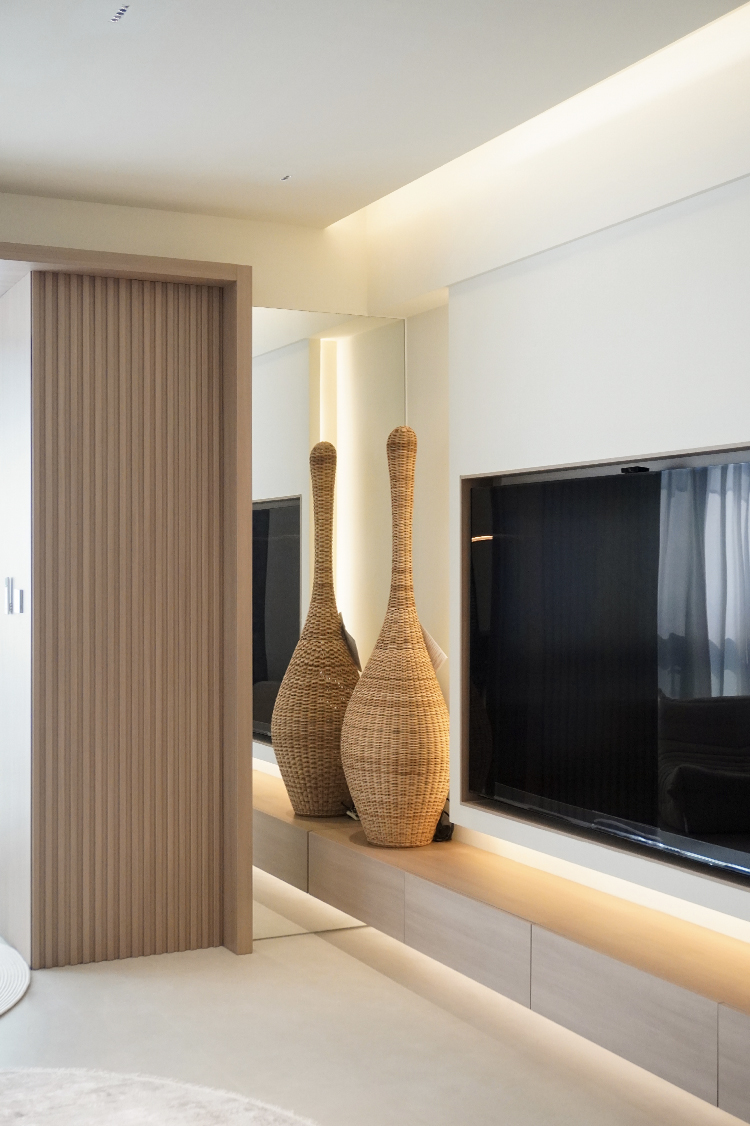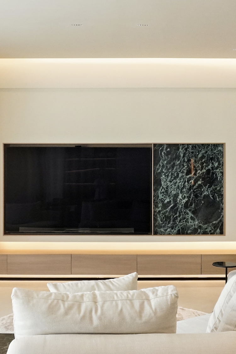 柔和的暖色演绎空间主体基调,辅以材质的细腻质感,宛如治愈系静奢秘境。暖白沙发与地毯默契配合,围合出松弛的弧形场域。木质优雅铺就墙面动线,为空间注入自然的舒适感。电视背景墙在不对称结构中加入墨绿石材,带来恰到好处的硬度与冷色,适度平衡空间。