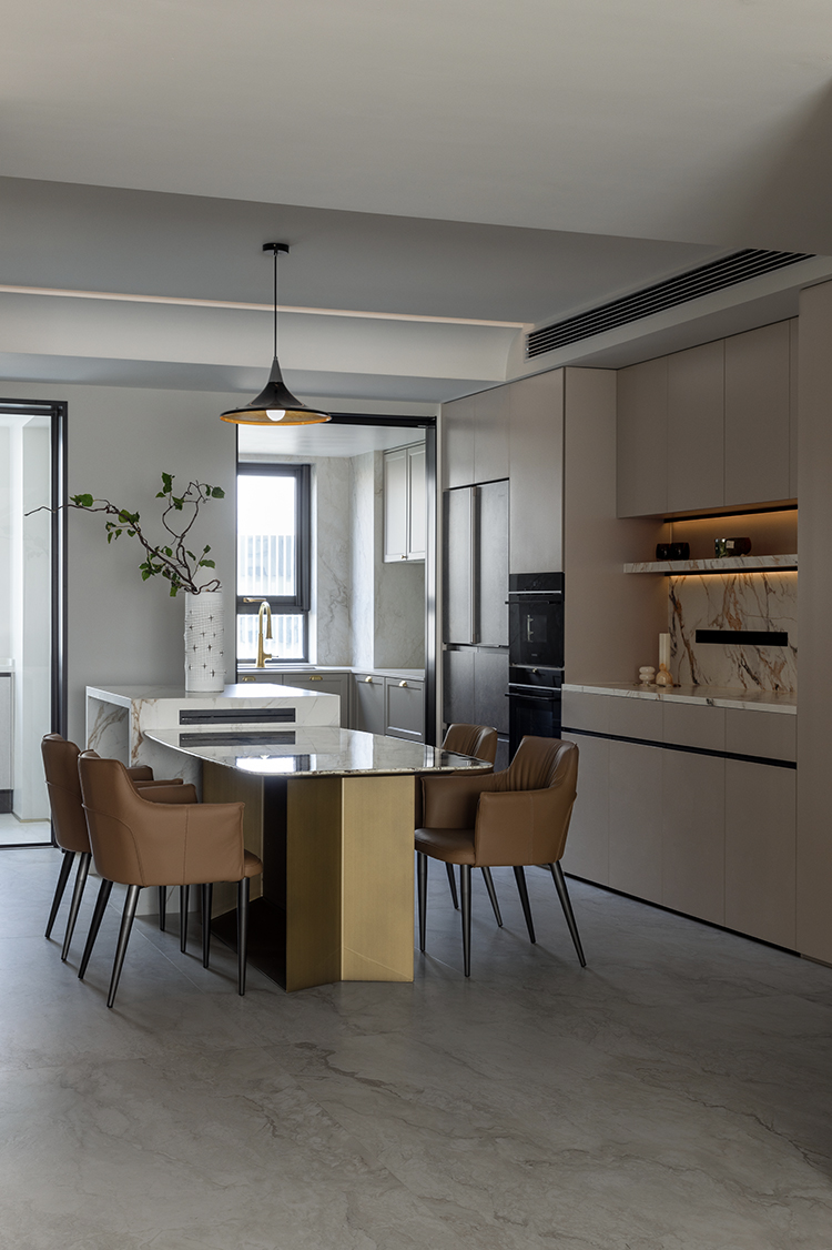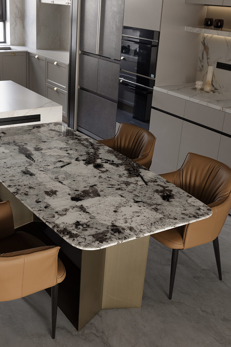 餐厅区域设置4人位的餐桌,满足业主的日常用餐需求,餐桌与岛台的结合设计,符合业主对空间利用和社交互动的需求。这种设计也有助于增加空间的流动性,让厨房与餐厅之间的转换更加流畅自然,岛台提供了额外的操作空间,可以用于食材处理、烘焙或其他厨房活动。岛台下方通常配有储物柜,增加了厨房的储物能力。