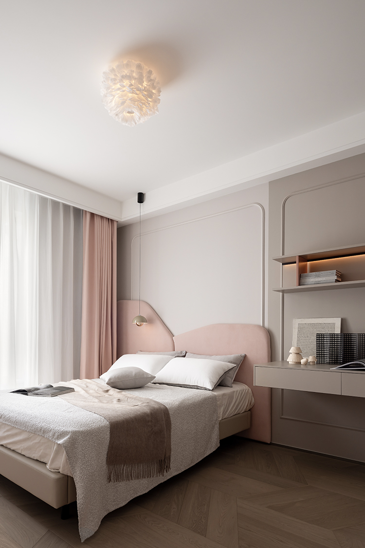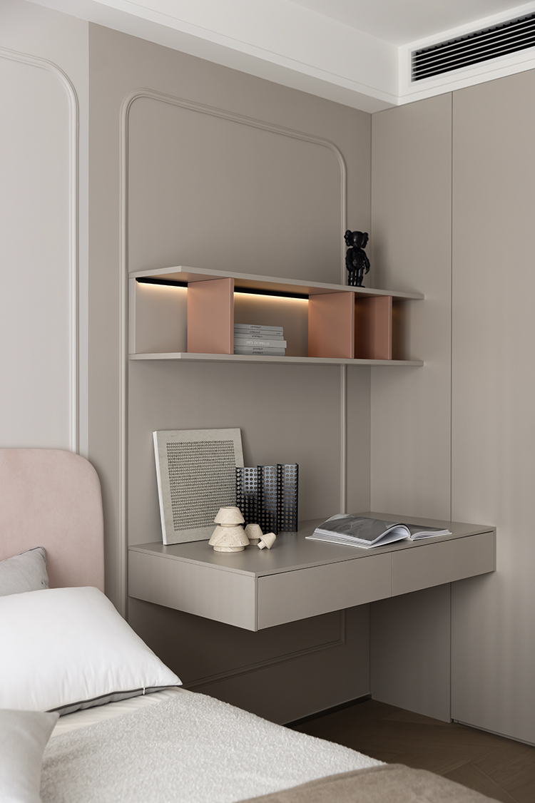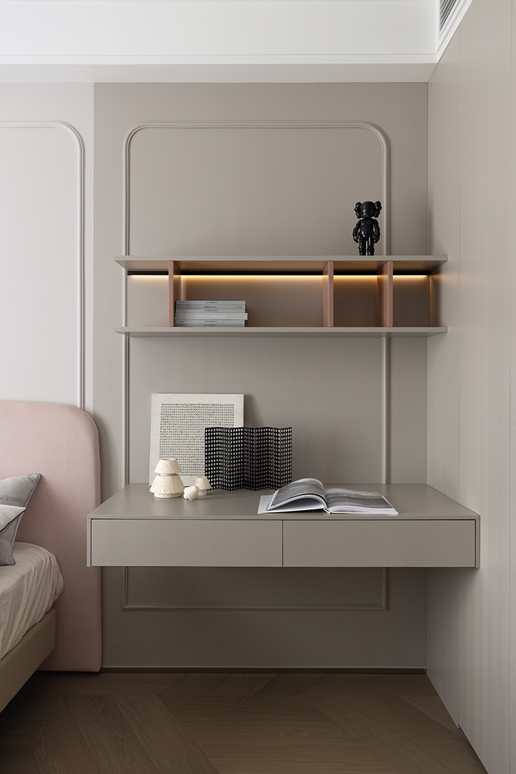 女儿房打造粉色异形墙板,营造出充满想象力和趣味性的空间,让孩子感受到居住环境的温馨和可爱。一字型悬浮书桌减少了厚重感,使整个房间看起来开阔又大气,依托墙体打造的大容量收纳柜,不仅实现了不同类别物品的收纳需求,也满足了孩子不同阶段的收纳使用。