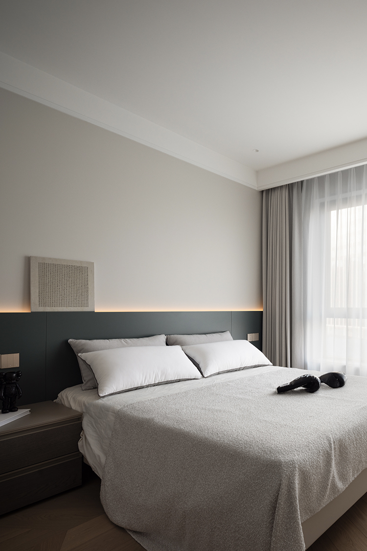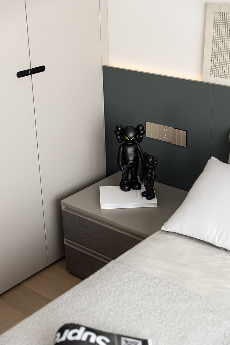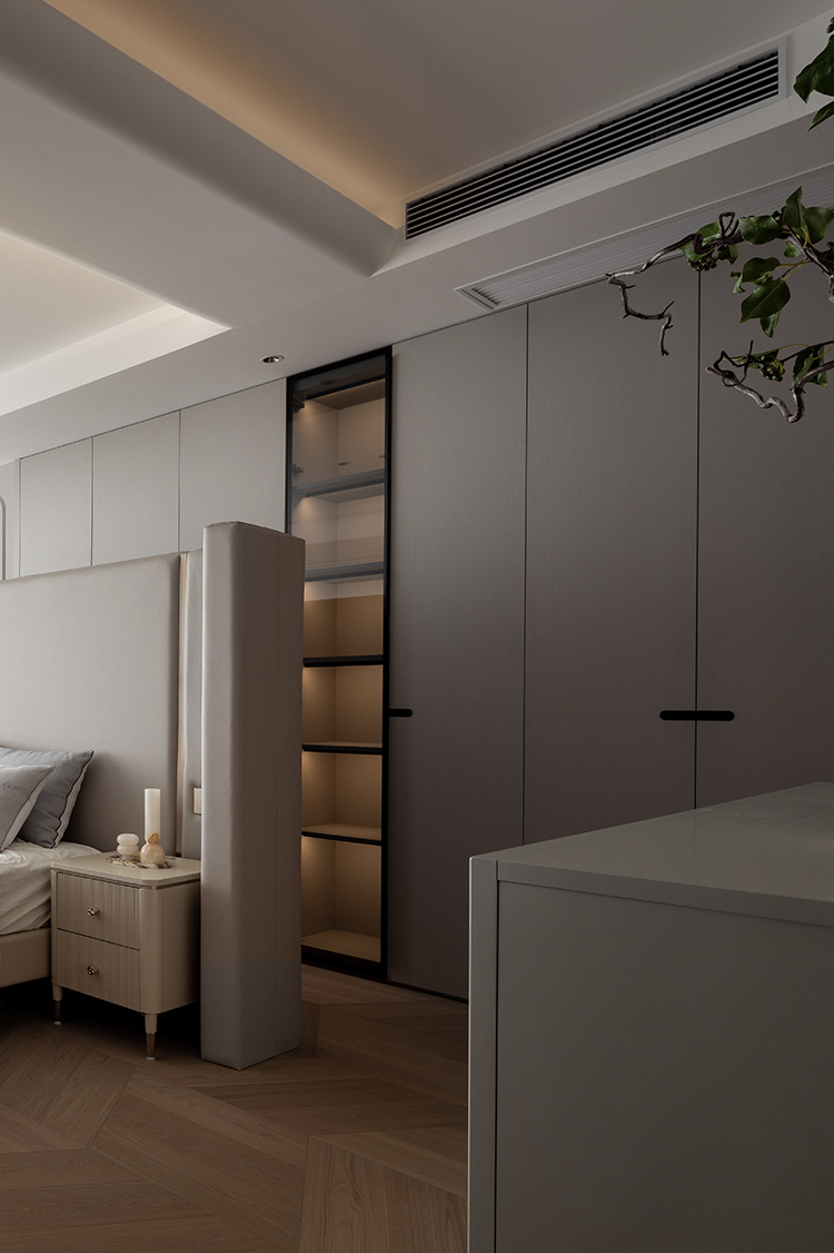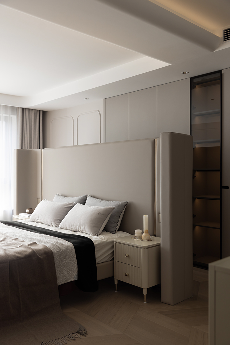床头不靠墙的设计不仅具有视觉上的冲击力,也增加了卧室的层次感和设计感,同时保持了其实用性,使得卧室既是休息的场所,也是展示个人品味的空间。居中的床布局打破了传统的设计模式,卧室空间更加流畅,便于日常活动,同时也为卧室带来了新的视角和体验。