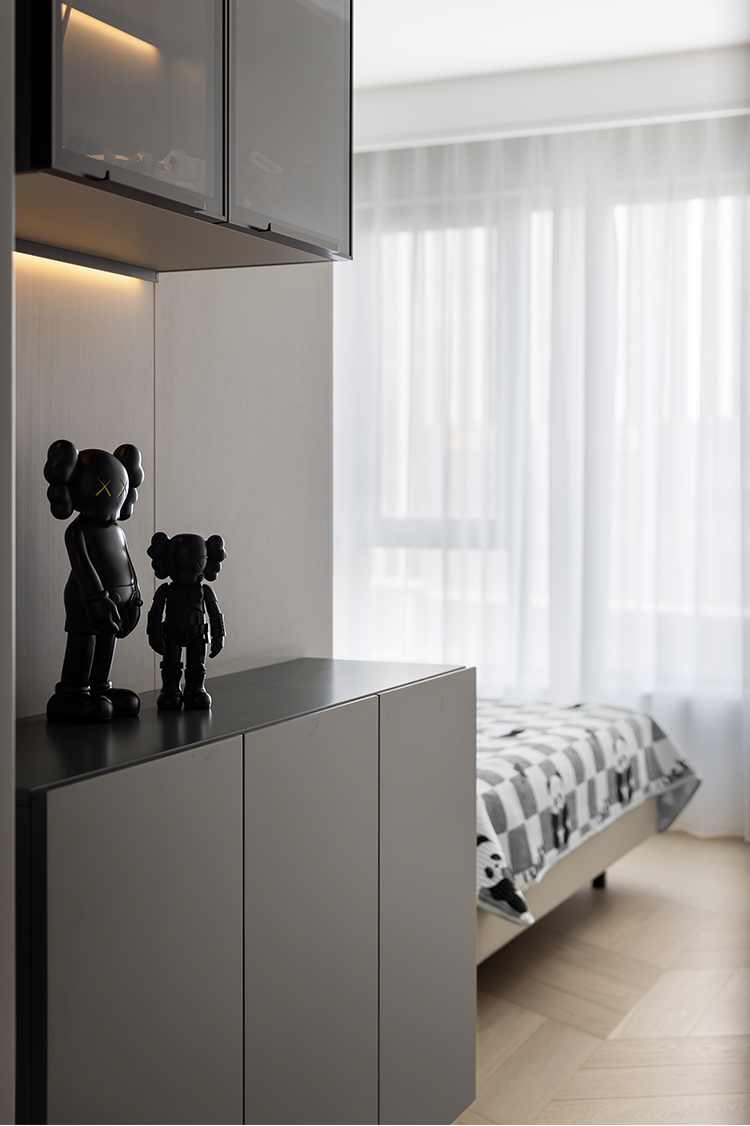 将绿色作为男孩子的装饰色,营造一个自然舒适的居住空间,在绿色环境成长,可以减少焦虑,提升愉悦感和积极性。在进门处形成狭长的过道区域,用透明收纳柜的设计可以保持空间的通透性,使得过道区域看起来更加宽敞明亮。依托墙体打造的收纳柜使得整个房间看起来更加整洁和统一,包括多种收纳空间,如挂衣区、抽屉、隔层等,有助于孩子学习物品的分类存放,从而建立良好的收纳规则。