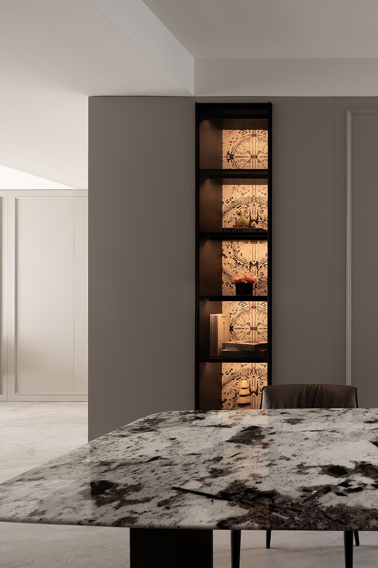 选用简约线条的墙体规划,大块的留白与极简的线条显露轻奢,干净利落的设计轻松打造高级感,以白色、灰色为主色调,营造出简约、自然的氛围,这些颜色减少了视觉上的障碍,使得客餐厅一体化设计更加流畅和通透。