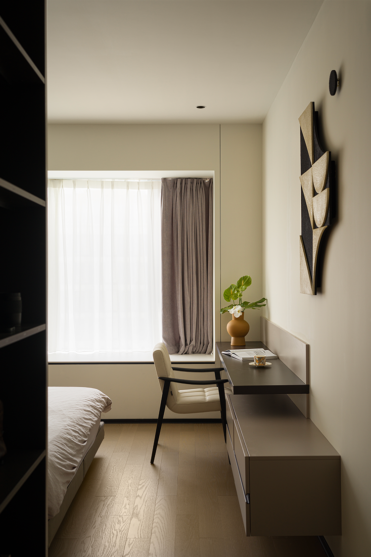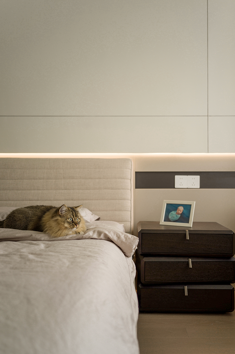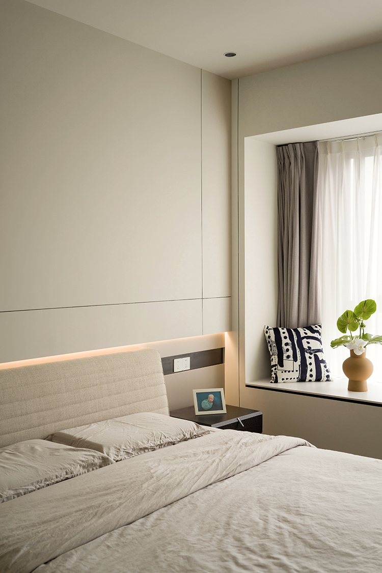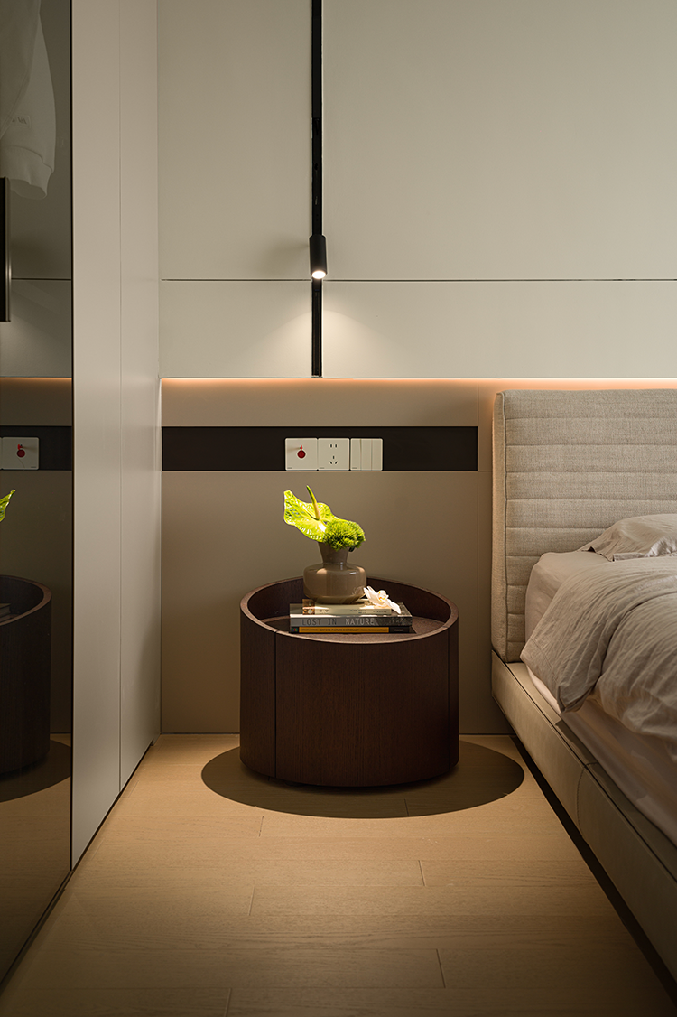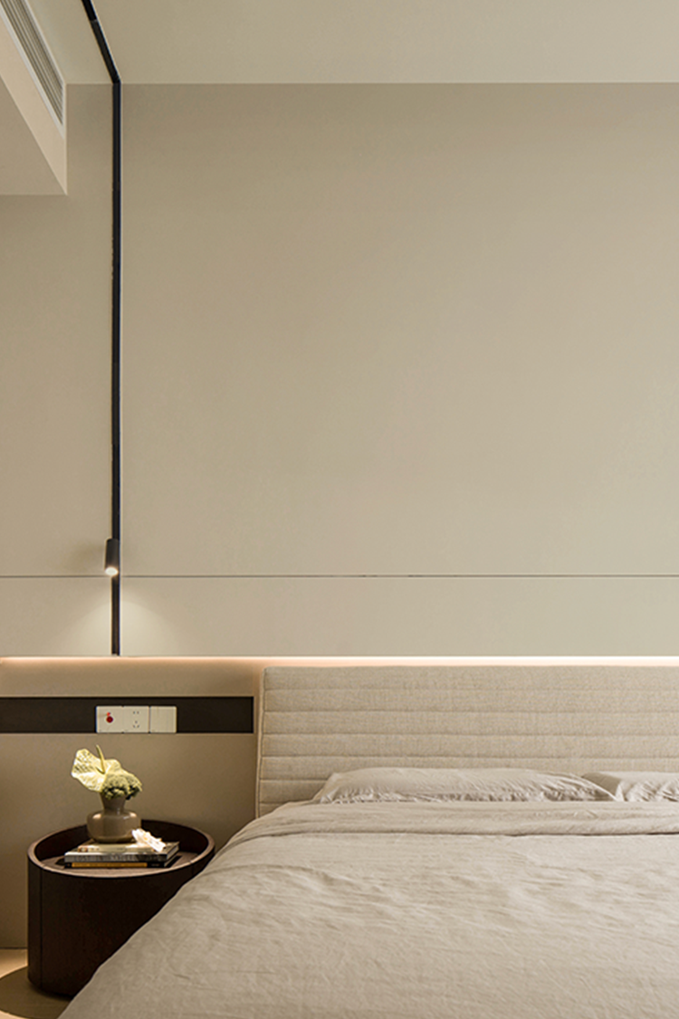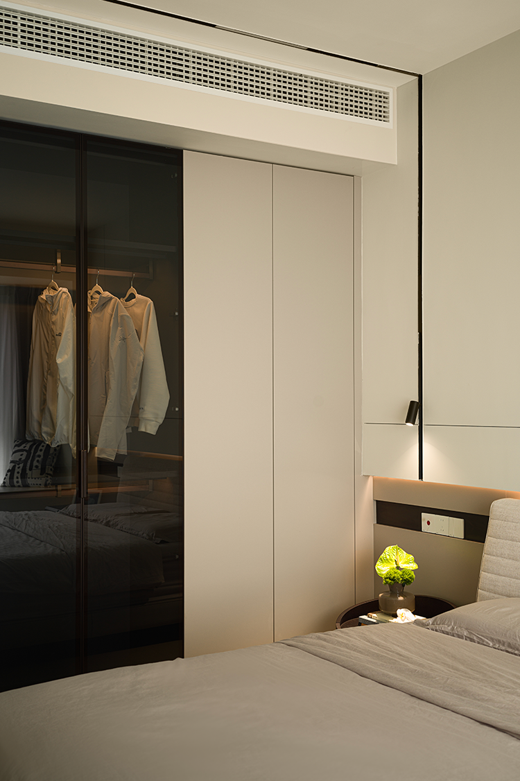 静谧暖白成为空间基调,偶尔点缀黑线条或艺术感形状,淡雅而不显单调。布艺床头背板置入错层背景墙,既呈现质感上的柔软性,又形成安稳庇护感。衣柜加入深色玻璃门,倍显低调与矜贵,给予生活精致的仪式感。