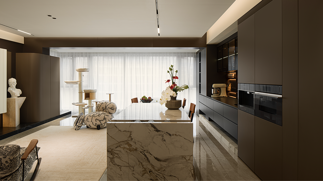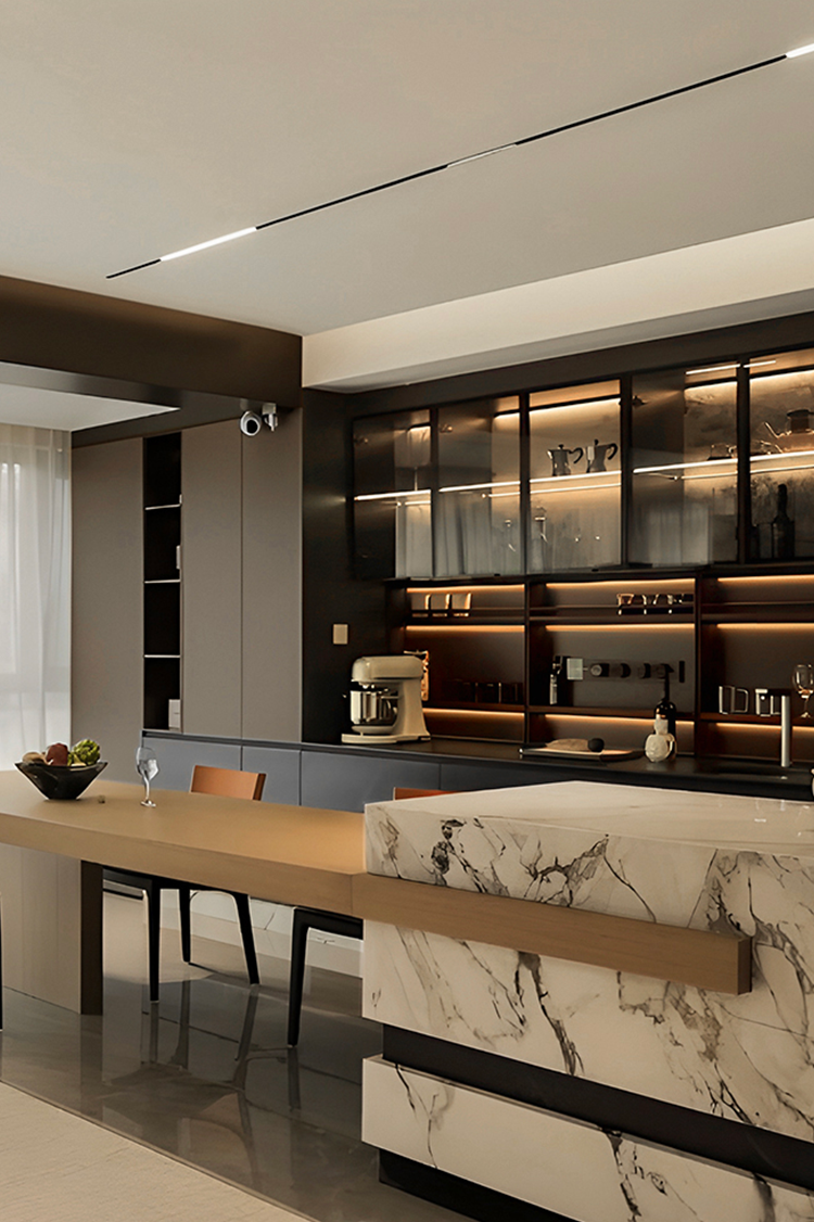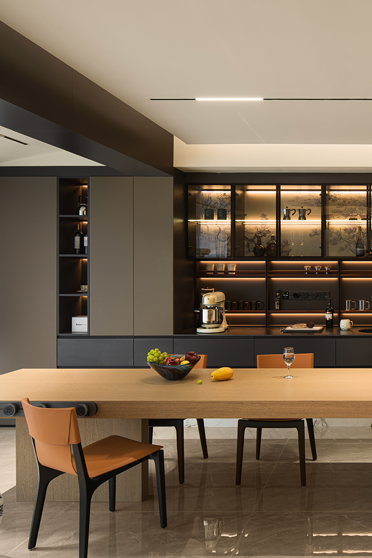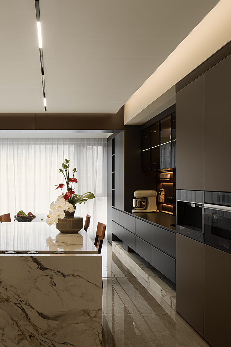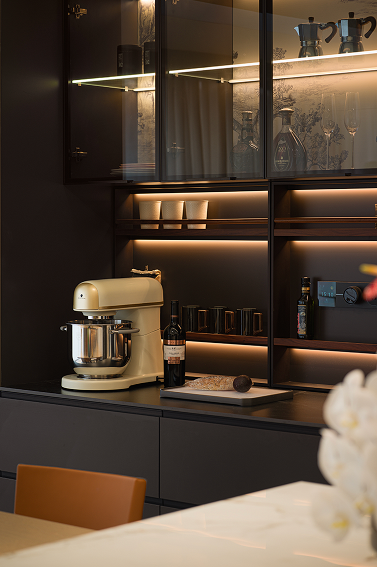 开放式布局消隐了空间中的具象区隔。橱柜向上延伸灰色吊顶,构建与客厅的衔接秩序,同时向侧面延展隐形门,形成完整墙面视觉。木质及黑线穿插的大理石岛台,兼顾设计与功用。透明玻璃柜映射唯美印花与氛围光影,承载闲时的兴致和乐趣。