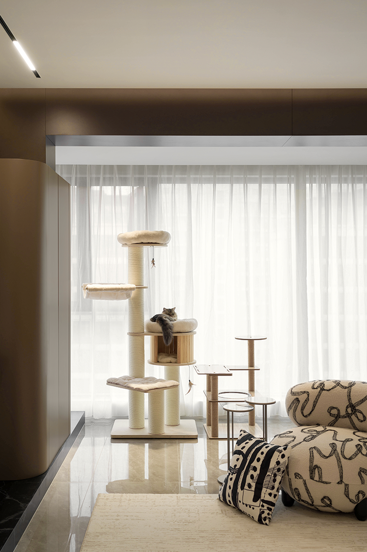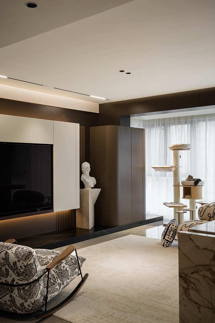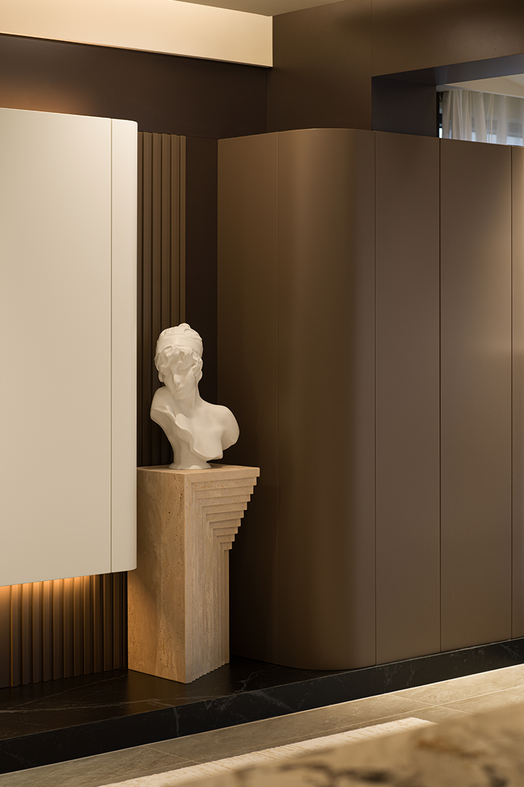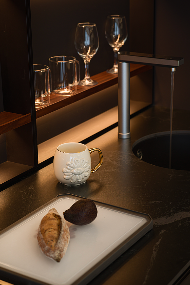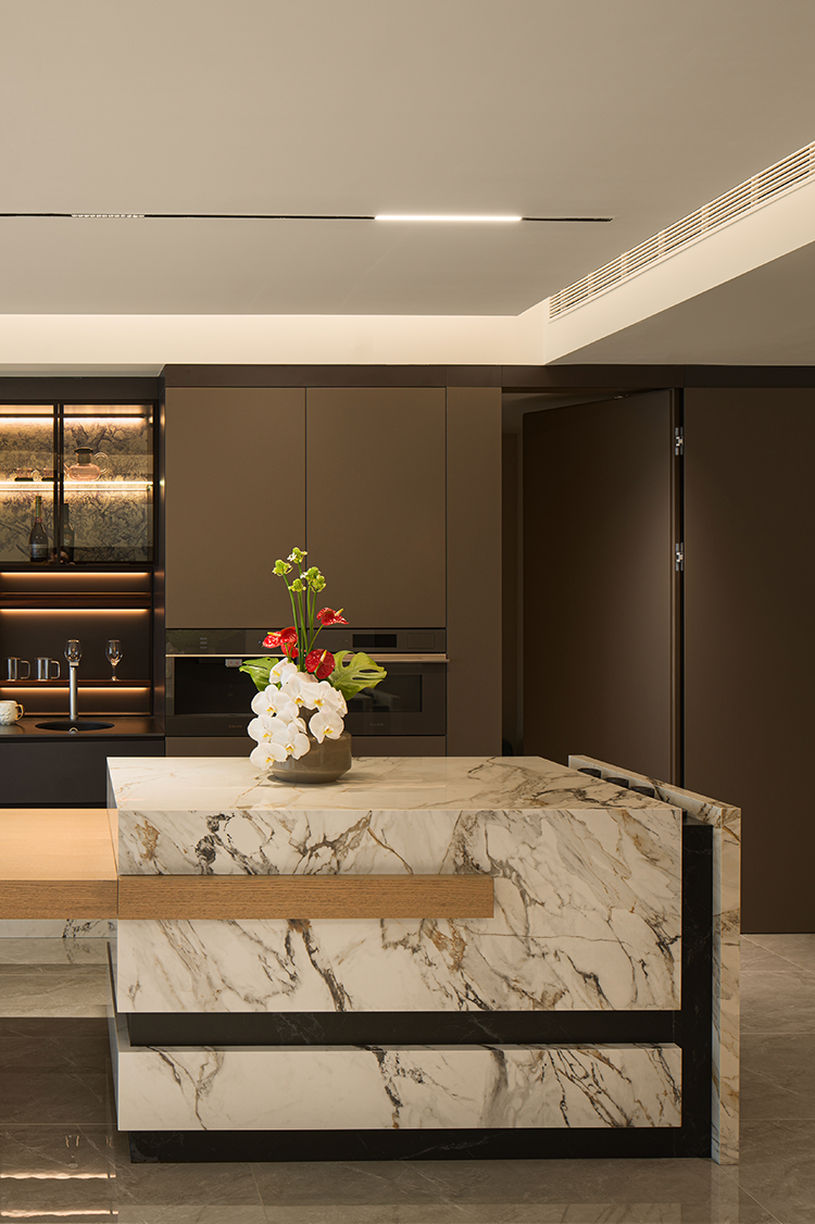 开放式布局消隐了空间中的具象区隔。橱柜向上延伸灰色吊顶,构建与客厅的衔接秩序,同时向侧面延展隐形门,形成完整墙面视觉。木质及黑线穿插的大理石岛台,兼顾设计与功用。透明玻璃柜映射唯美印花与氛围光影,承载闲时的兴致和乐趣。