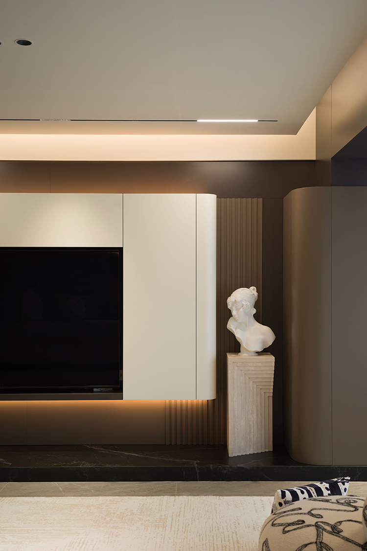 由灰与白构筑的简约境地,既表达现代空间的庄重感,亦存有温暖笔触。白色悬浮厅柜,融入雕塑般的墙面结构,任凭弧面与直线交错穿插,丰盈而不凌乱。轻巧的布艺休闲椅取代大体量沙发,在预留出的开阔空间中,暖白地毯成为松弛日常的自由地。